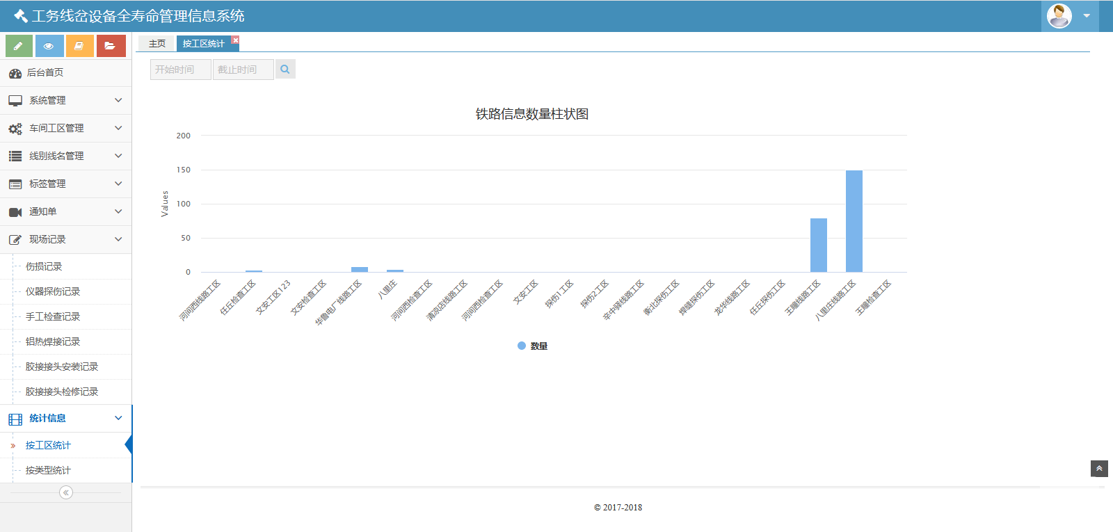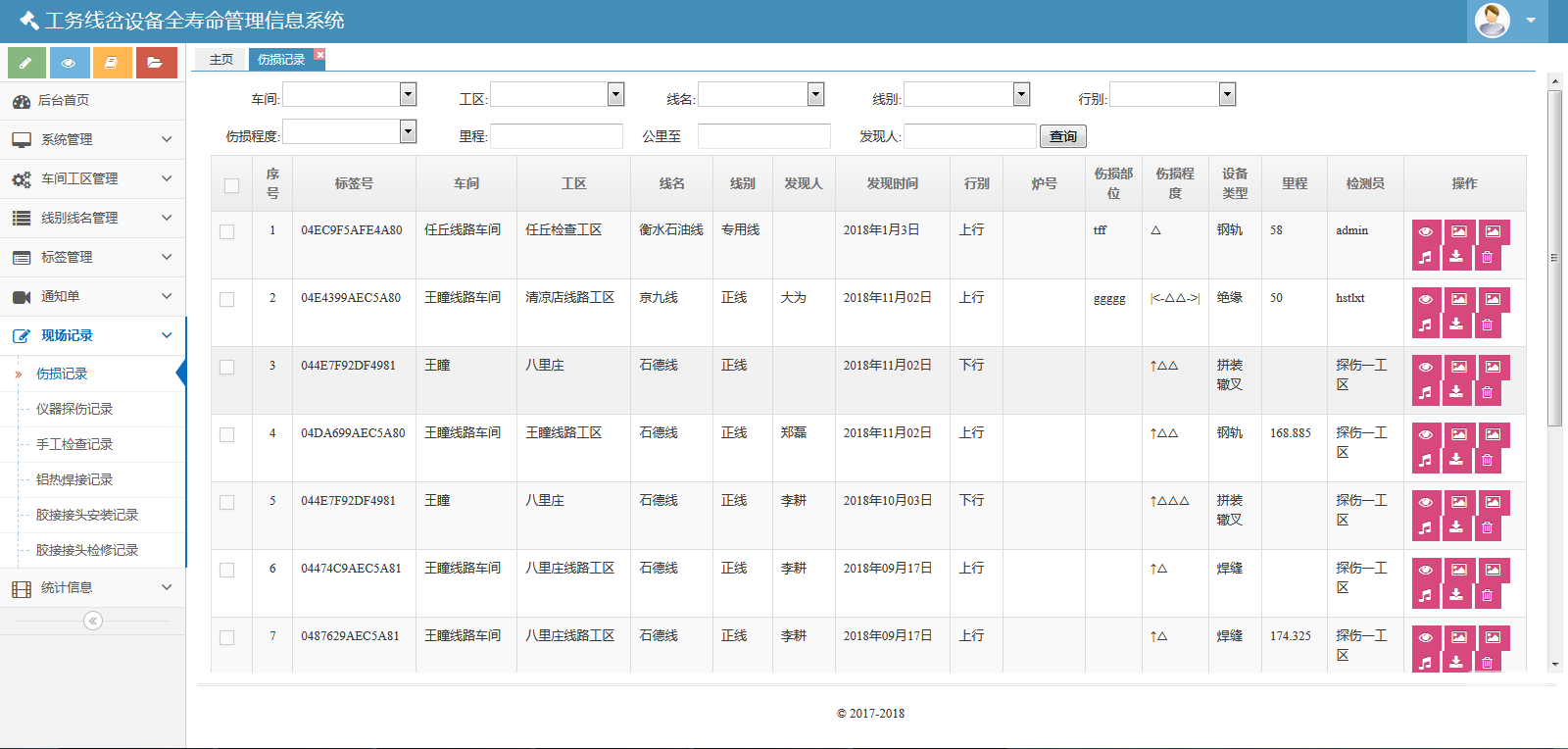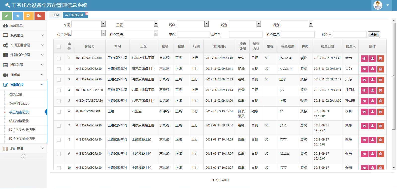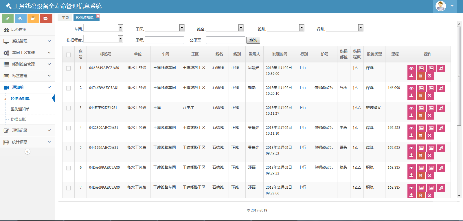 該系統(tǒng)包括七個模塊:系統(tǒng)管理、車間工區(qū)管理、線別線名管理、標簽管理、通知單、現(xiàn)場記錄和統(tǒng)計信息。該系統(tǒng)可以對數(shù)據(jù)庫進行備份與還原??梢怨芾碛脩襞c角色。也可以管理車間、線名線別、標簽??梢陨刹С鲚p傷通知單、重傷通知單、傷損臺賬。也可以生成并維護、導出傷損記錄、儀器探傷記錄、手工檢查記錄、鋁熱焊接記錄、膠接接頭安裝記錄、膠接接頭檢修記錄。還可以按照工區(qū)、類型統(tǒng)計鐵路信息。