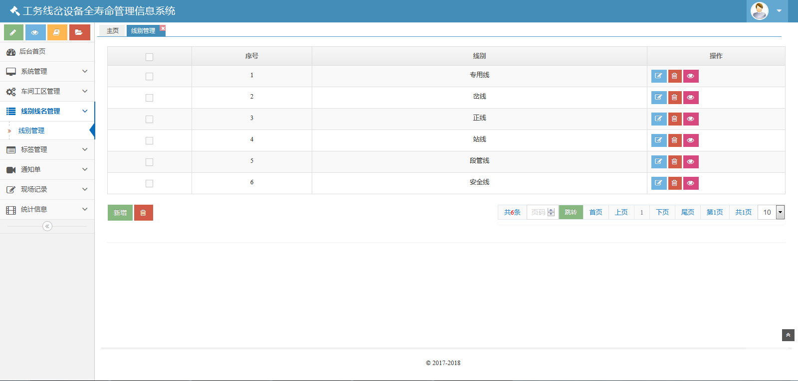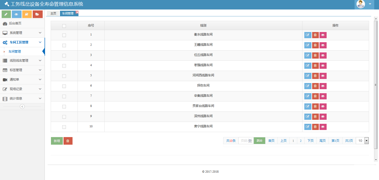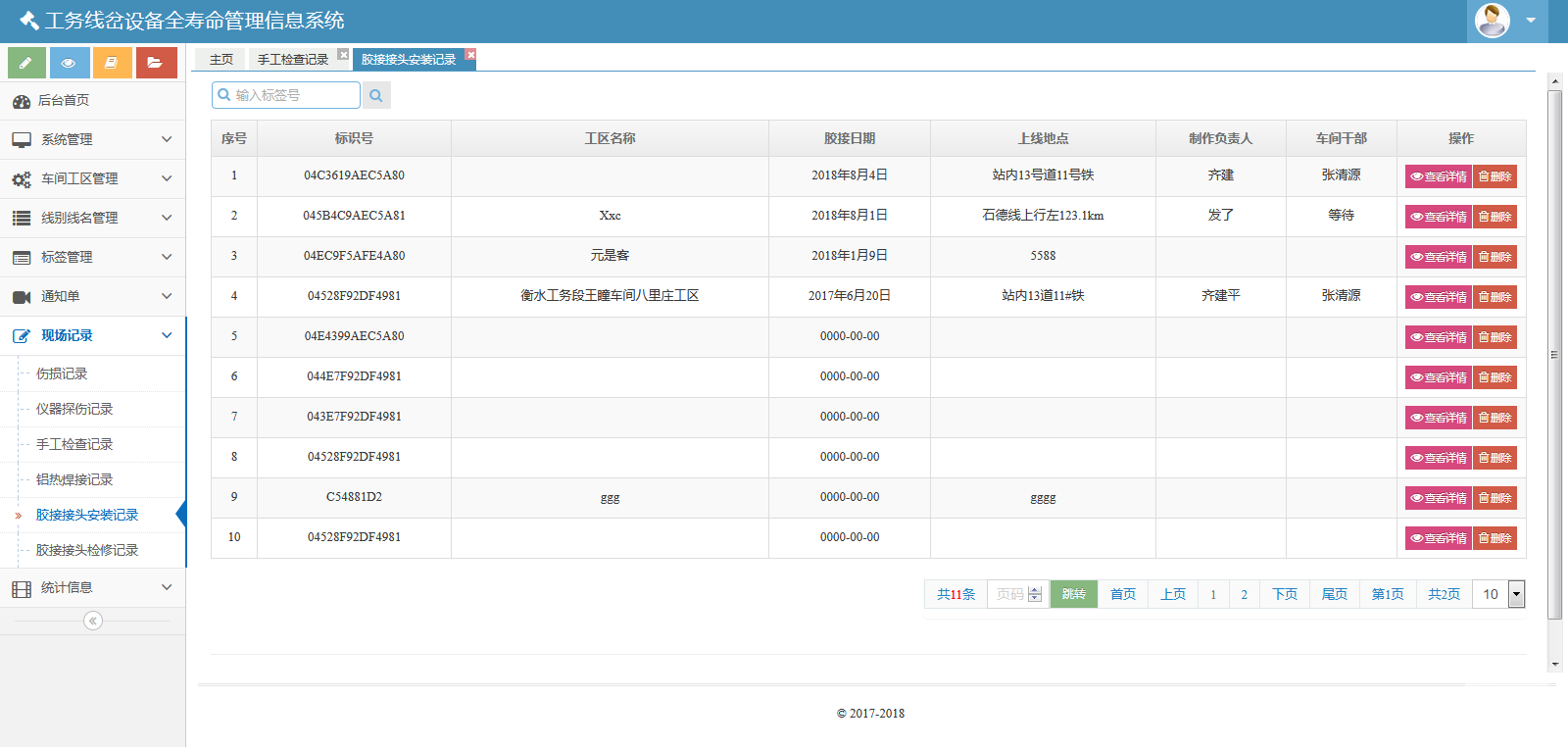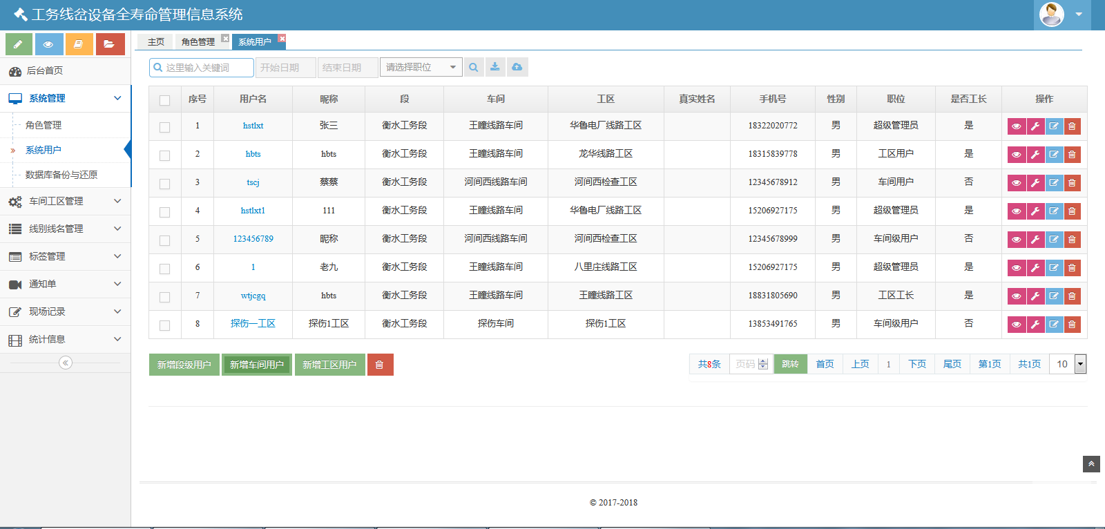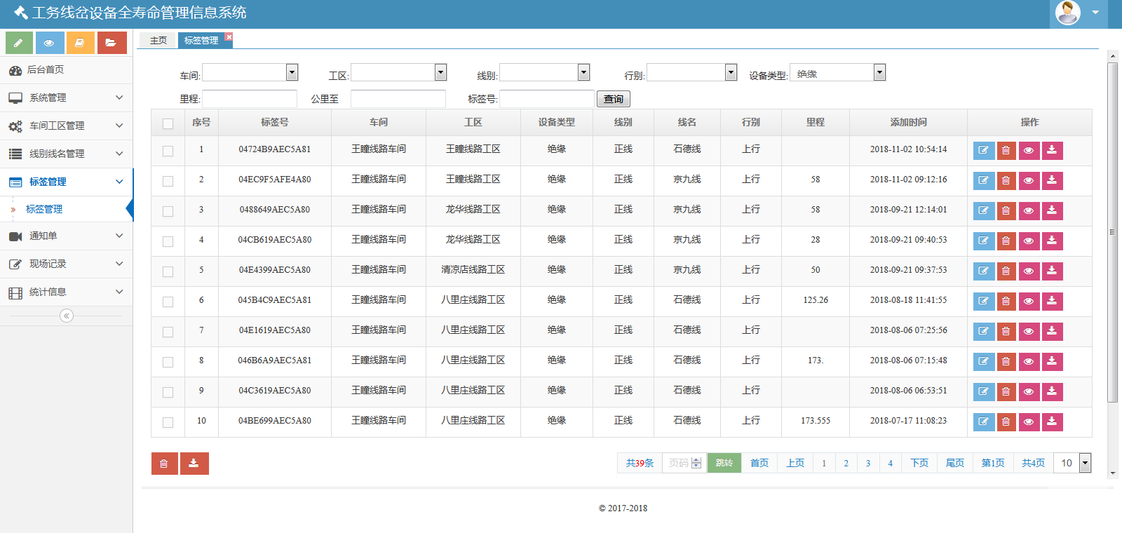 該系統(tǒng)包括七個模塊:系統(tǒng)管理、車間工區(qū)管理、線別線名管理、標簽管理、通知單、現(xiàn)場記錄和統(tǒng)計信息。該系統(tǒng)可以對數(shù)據(jù)庫進行備份與還原??梢怨芾碛脩襞c角色。也可以管理車間、線名線別、標簽??梢陨刹С鲚p傷通知單、重傷通知單、傷損臺賬。也可以生成并維護、導出傷損記錄、儀器探傷記錄、手工檢查記錄、鋁熱焊接記錄、膠接接頭安裝記錄、膠接接頭檢修記錄。還可以按照工區(qū)、類型統(tǒng)計鐵路信息。